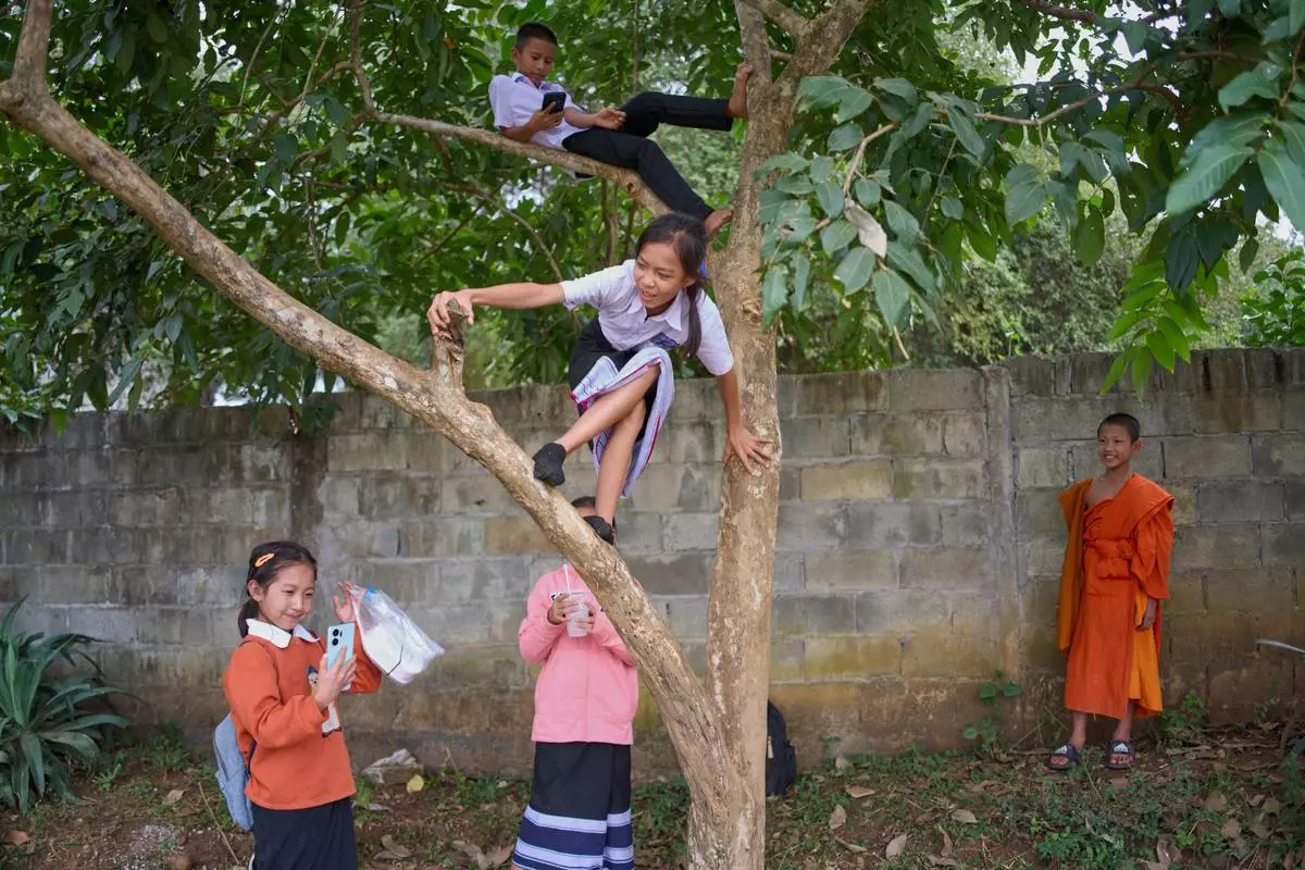 Students from an elementary school, including a novice Buddhist monk, play after class in Luang Prabang, Laos, Tuesday, Nov. 4, 2025. (AP Photo/Eugene Hoshiko)