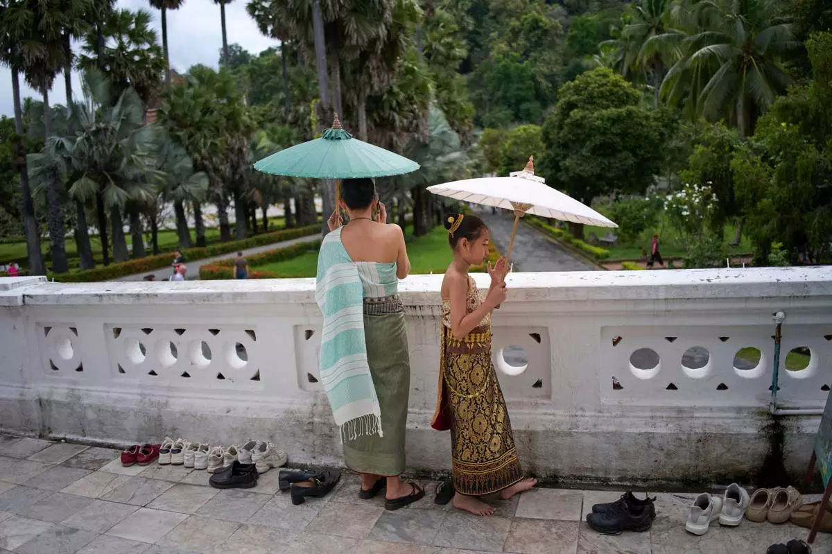 A woman and a young girl wearing traditional formal Lao dress stand barefoot as they hold parasols on a temple terrace in Luang Prabang, Laos, Sunday, Nov. 2, 2025. (AP Photo/Eugene Hoshiko)