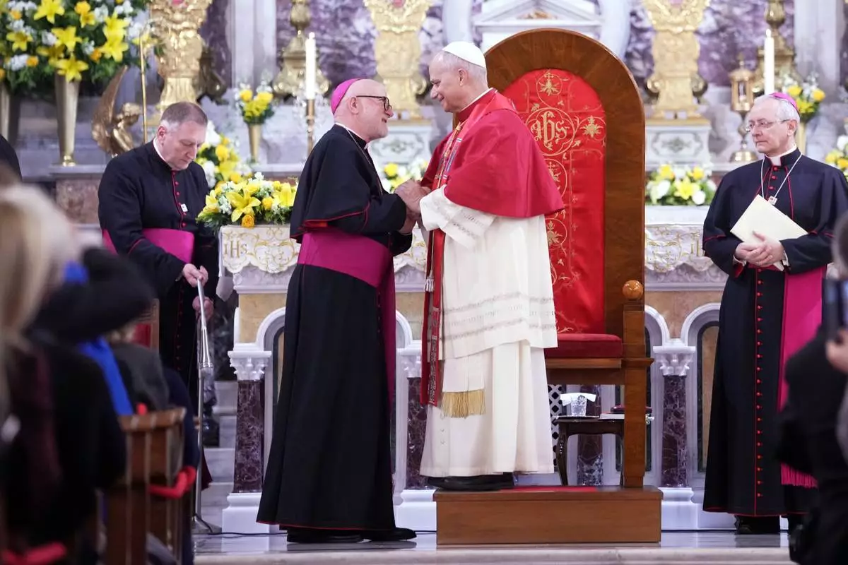 Pope Leo XIV talks with Archbishop Martin Kmetec of Izmir during a meeting with the clergy at the Cathedral of the Holy Spirit, in Istanbul, Turkey, Friday, Nov. 28, 2025. (AP Photo/Domenico Stinellis)