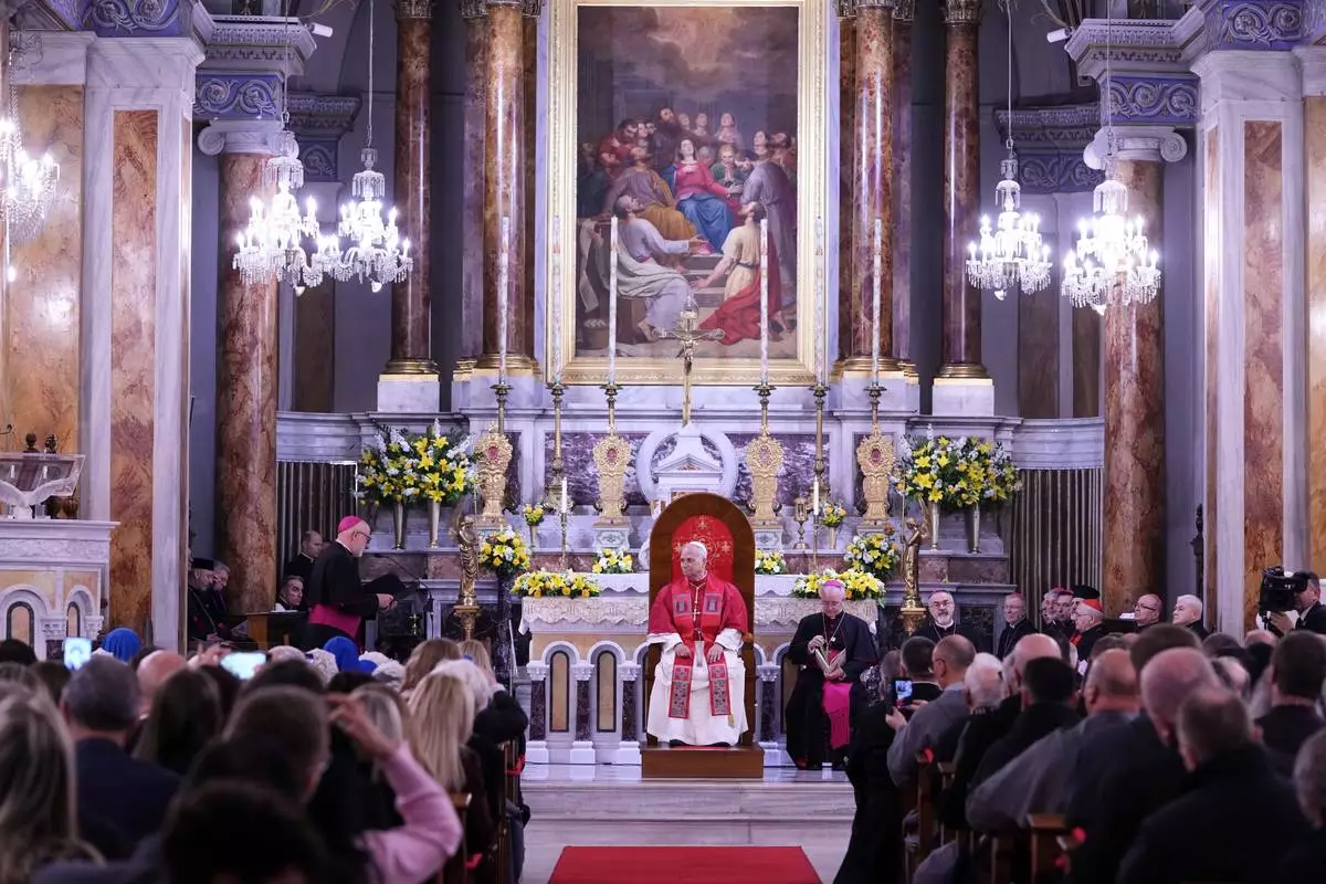 Pope Leo XIV meets the clergy at the Cathedral of the Holy Spirit, in Istanbul, Turkey, Friday, Nov. 28, 2025. (AP Photo/Domenico Stinellis)