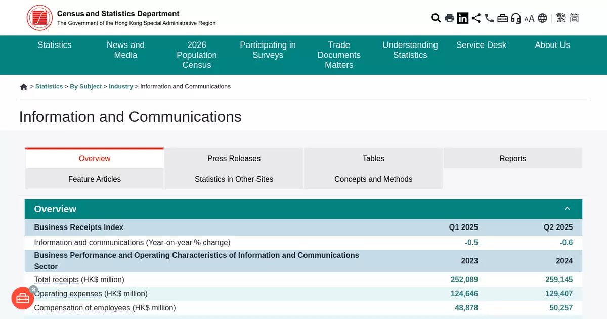 Selected statistics for the sectors mentioned above are shown in the attached table. More detailed statistics will be given in the reports "Key Statistics on Business Performance and Operating Characteristics of the Information and Communications Sector in 2024" and "Key Statistics on Business Performance and Operating Characteristics of the Financing and Insurance, Professional and Business Services Sectors in 2024". Users can browse and download these reports at the website of the C&SD (www.censtatd.gov.hk/en/scode560.html and www.censtatd.gov.hk/en/scode570.html) as from end-December 2025.