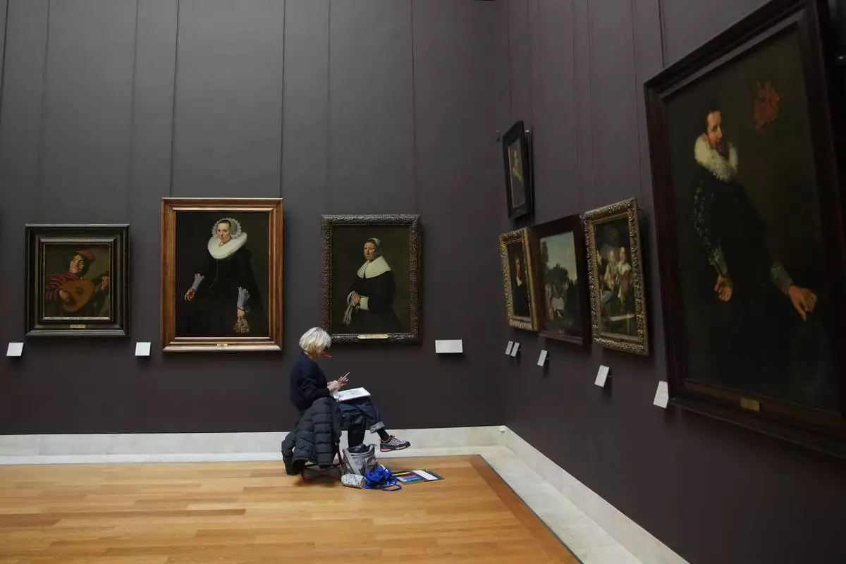 A woman draws in the Richelieu gallery of Le Louvre museum are seen Wednesday, Nov. 19, 2025 in Paris. (AP Photo/Christophe Ena)
