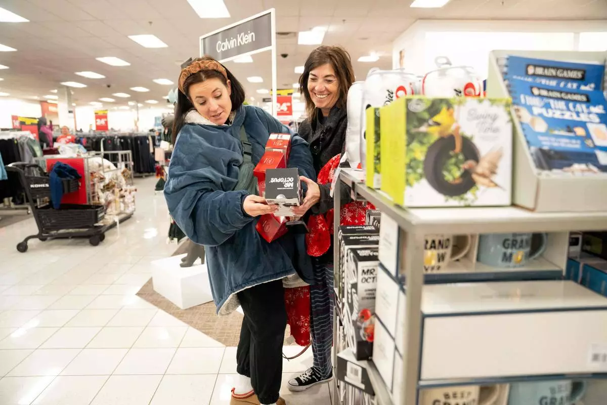 Becca Mendoza and Tammi Hines look at products as shoppers browse through Kohl's department store for Black Friday deals, Friday, Nov. 28, 2025, in Woodstock, Ga. (AP Photo/Megan Varner)