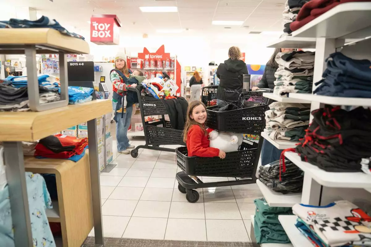 Eva Klein sits in the bottom of her grandmothers shopping cart as shoppers browse through Kohl's department store for Black Friday, Friday, Nov. 28, 2025, in Woodstock, Ga. (AP Photo/Megan Varner)