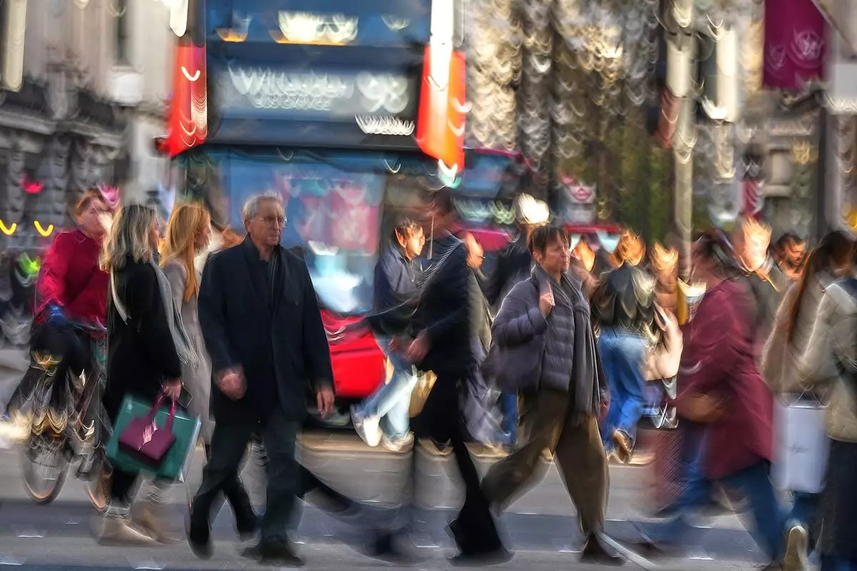 Shoppers walk along London's most famous shopping Street, Oxford Street, on black Friday in London, Friday, Nov. 28, 2025. (AP Photo/Frank Augstein)