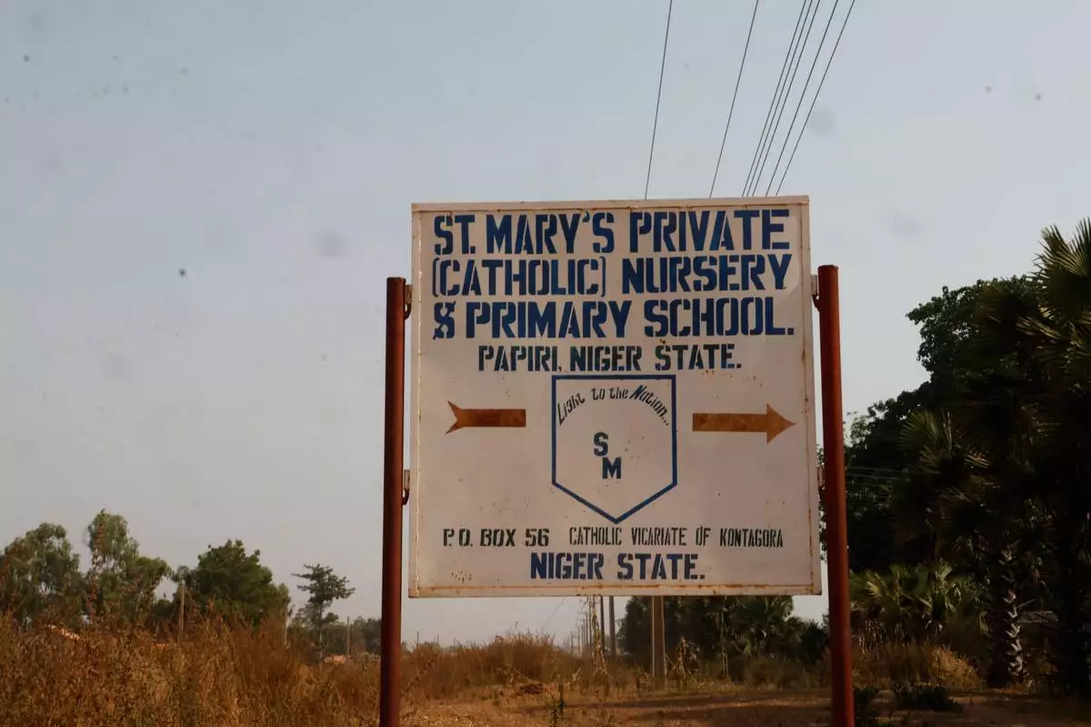 A sign of St. Mary's Catholic Primary and Secondary School is shown, in Papiri community, Nigeria, Friday, Nov. 28, 2025. (AP Photo )