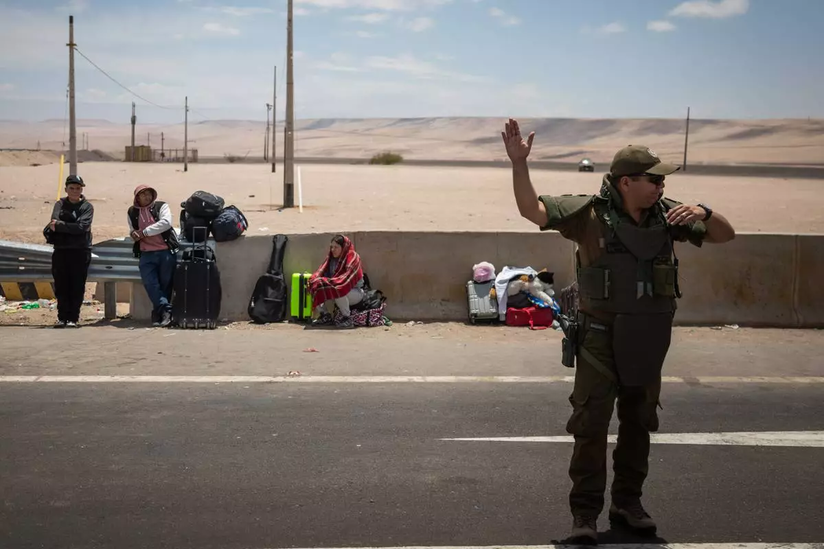 A police officer directs traffic at the Chacalluta border crossing point in Arica, Chile, Friday, Nov. 28, 2025, as migrants wait to cross into Peru. (AP Photo/Ibar Silva)