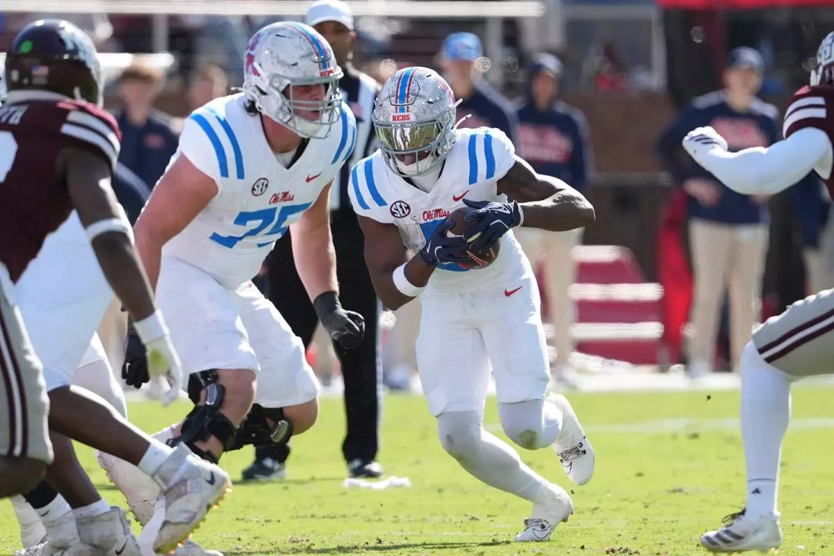 Mississippi running back Kewan Lacy (5) follows the block by offensive lineman Patrick Kutas (75) during the first half of an NCAA college football game against Mississippi State, Frifday, Nov. 28, 2025, in Starkville, Miss. (AP Photo/Rogelio V. Solis)
