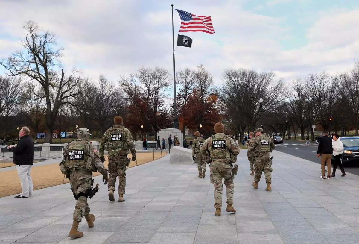 National Guard patrol the National Mall near the Lincoln Memorial, Friday, Nov. 28, 2025, in Washington. (AP Photo/Rahmat Gul)