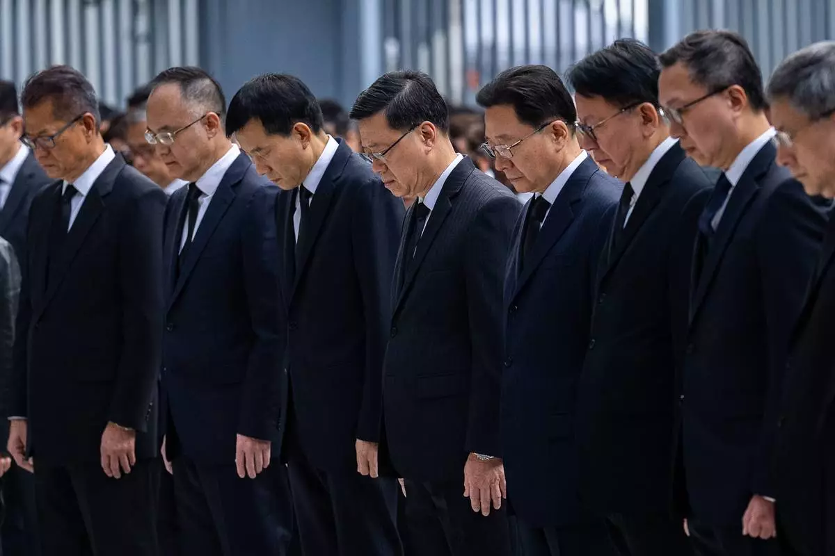 Hong Kong Chief Executive John lee, center and other officers observe a moment of silence for the victims of the deadly fire that started Wednesday at Wang Fuk Court, a residential estate in the Tai Po district of Hong Kong's New Territories, Saturday, Nov. 29, 2025. (AP Photo/Chan Long Hei)