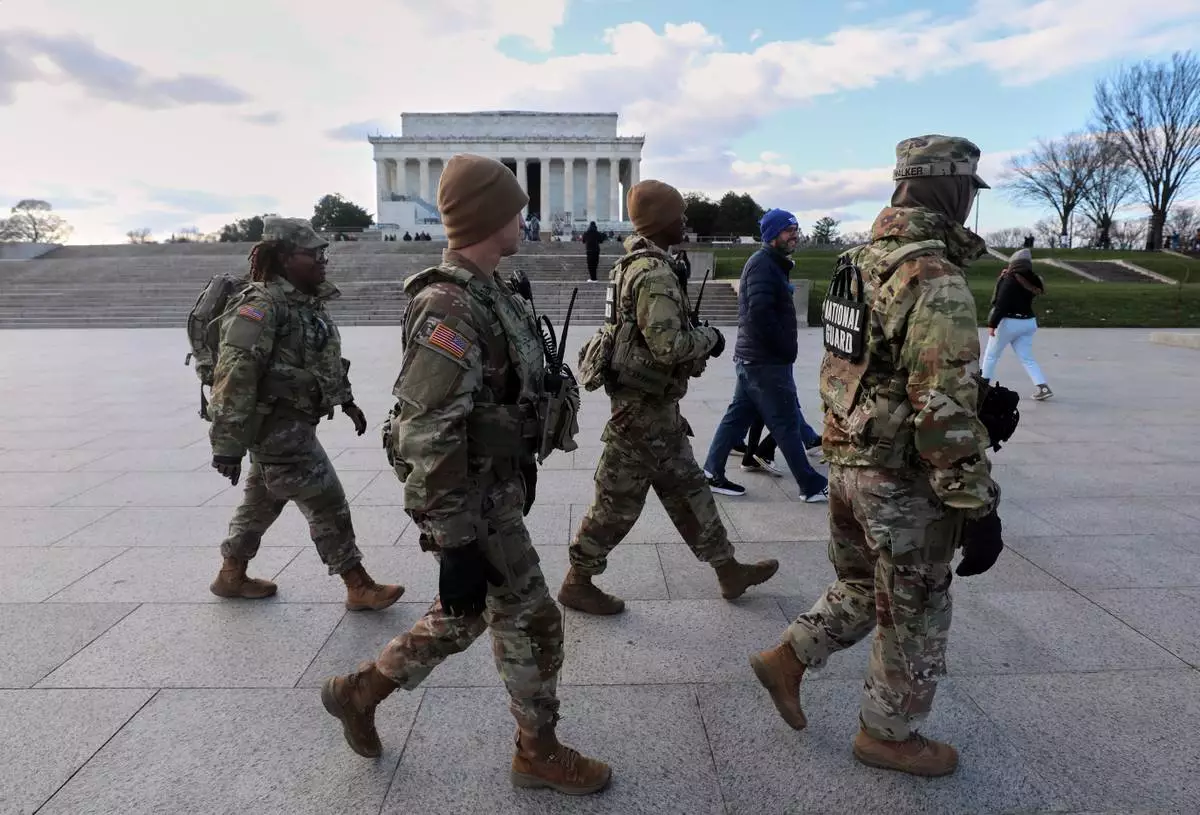 National Guard patrol the National Mall near the Lincoln Memorial, Friday, Nov. 28, 2025, in Washington. (AP Photo/Rahmat Gul)