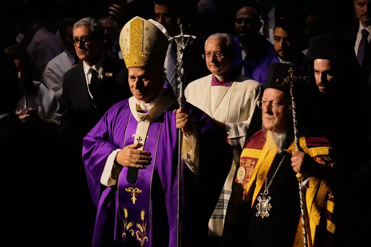 Pope Leo XIV and Ecumenical Patriarch Bartholomew I, the spiritual leader of the world's Eastern Orthodox Christians attend the Doxology at the Patriarchal Church of Saint George, in Istanbul, Turkey, Saturday, Nov. 29, 2025. (AP Photo/Emrah Gurel)
