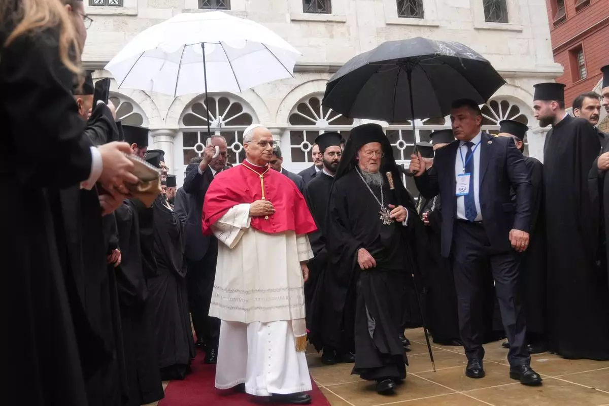 Pope Leo XIV and Ecumenical Patriarch Bartholomew I, the spiritual leader of the world's Eastern Orthodox Christians leave after a doxology service at the Patriarchal Church of Saint George, in Istanbul, Turkey, Saturday, Nov. 29, 2025. (AP Photo/Francisco Seco)