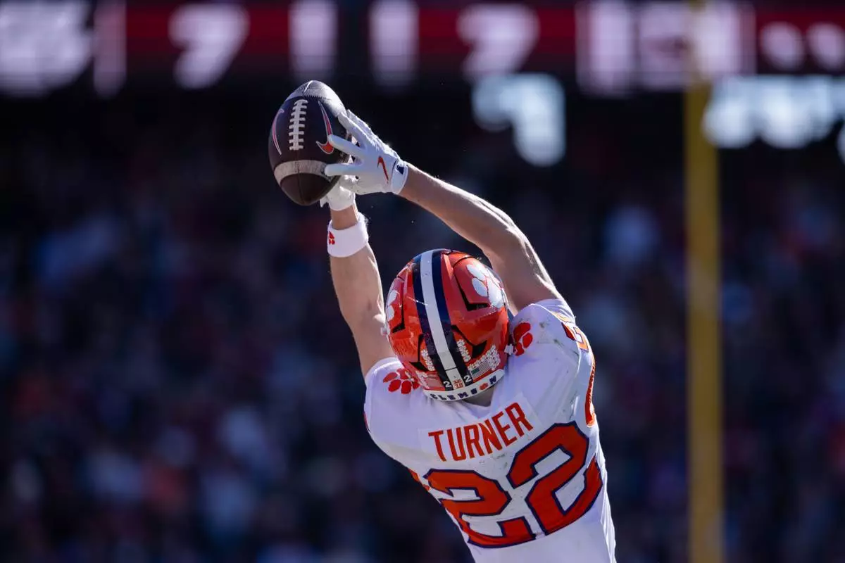 Clemson wide receiver Cole Turner (22) makes a catch against the South Carolina during the first half of an NCAA college football game, Saturday, Nov. 29, 2025, in Columbia, S.C. (AP Photo/Scott Kinser)