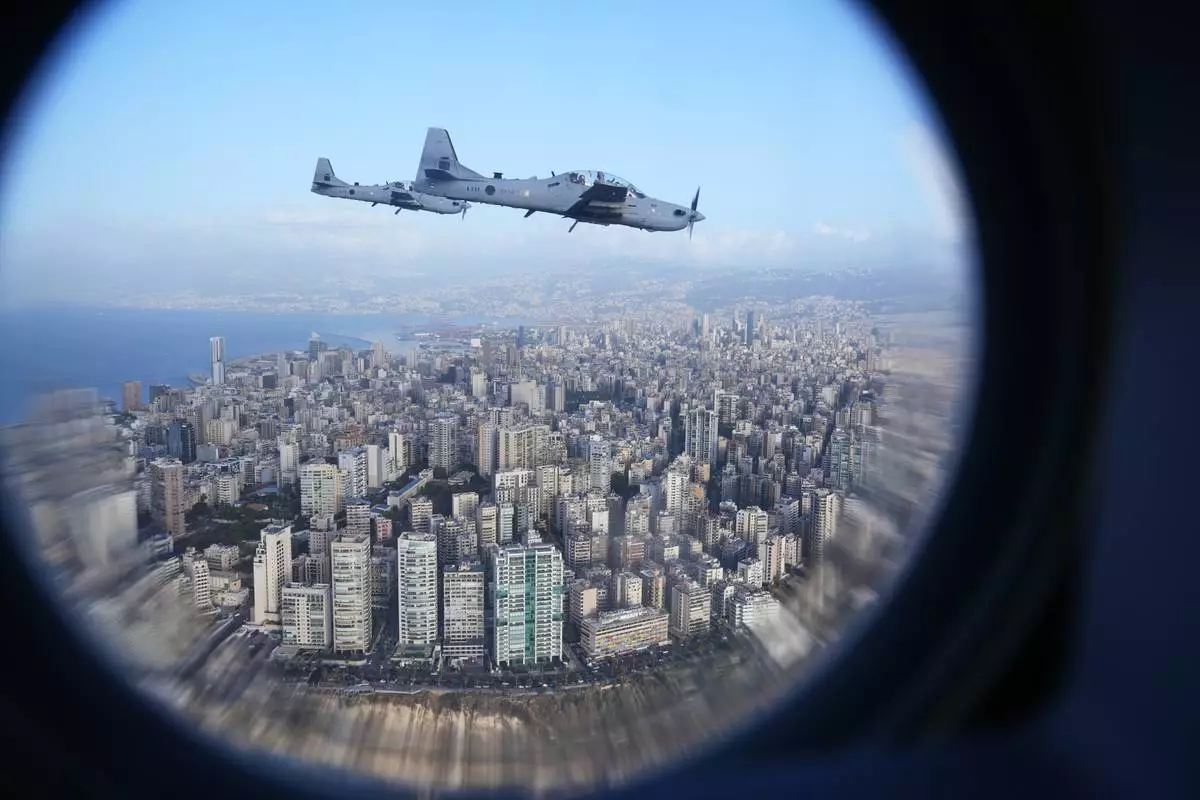Two Lebanese air force fighters escort Pope Leo XIV's plane as it flies over Beirut, Lebanon, on it's way to the international airport, Sunday, Nov. 30, 2025. (AP Photo/Domenico Stinellis)