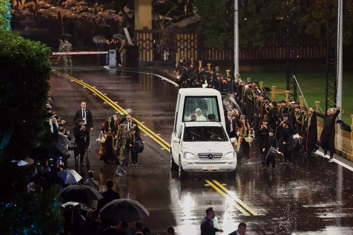 He moved through the streets of the Lebanese capital in a closed popemobile, a return to the past after Pope Francis eschewed closed popemobiles. Lebanese troops deployed on both sides of the road and a helicopter flew overhead.