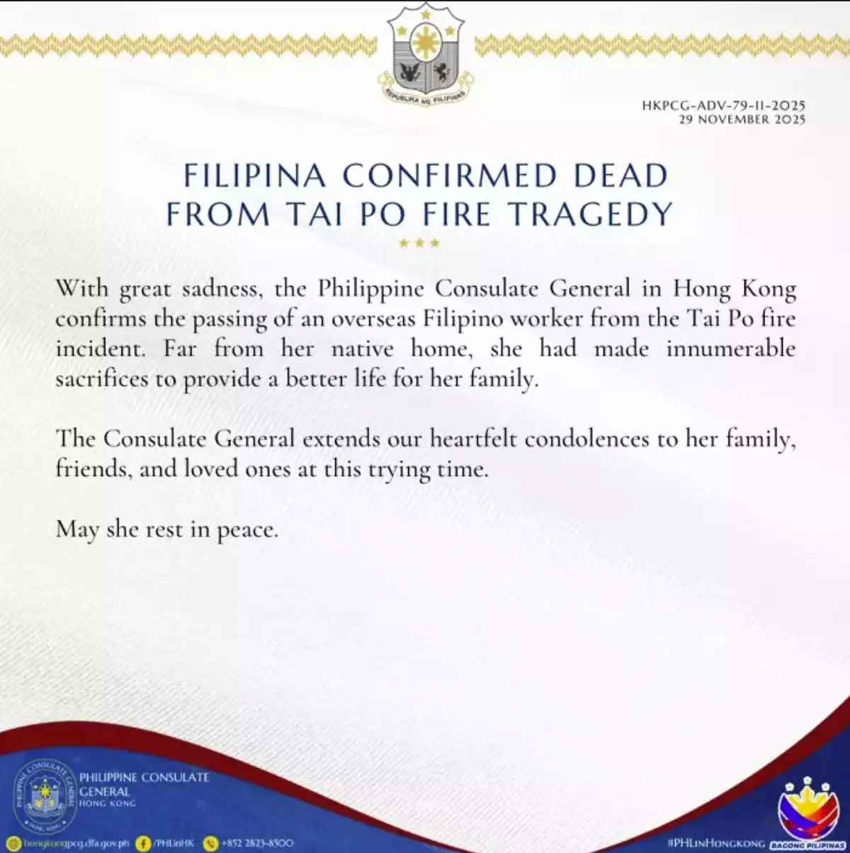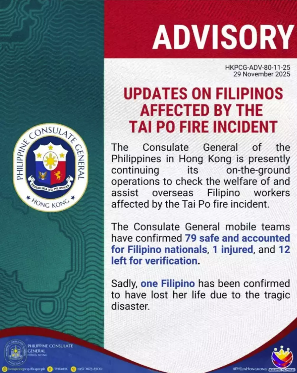 The Consulate General of the Philippines in Hong Kong confirmed that one Filipino died and one was injured in the No.5 Alarm fire at Wang Fuk Court in Tai Po. The consulate expressed its sincere condolences to her family, friends and relatives at this difficult time, praising her for making countless efforts far away from home to bring a better life to her family. The consulate hoped that the deceased would rest in peace. In addition, the consulate stated that the Consulate General mobile teams have confirmed 79 safe and accounted for Filipino nationals and 12 left for verification.