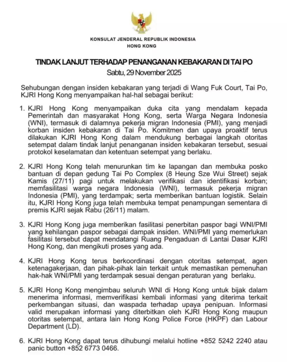 The Consulate General of the Republic of Indonesia in Hong Kong stated that, as of 11 a.m. on November 29th, the death toll of Indonesian foreign domestic helpers has reached seven, and multiple Indonesians have been injured. Some of the injured have been discharged from the hospital after treatment and placed in temporary accommodation. It is reported that about 140 Indonesians live in the units of WANG Fuk Court. The consulate will continue to provide comprehensive assistance and be responsible for the repatriation of the remains and related services.