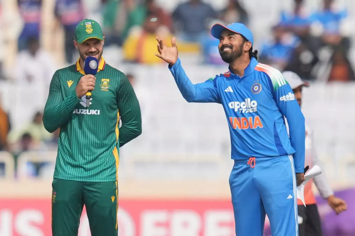 India's captain KL Rahul, right, flips coin for the toss as South Africa's captain Aiden Markram looks on during the first One Day International match between India and South Africa in Ranchi, India, Sunday, Nov. 30, 2025. (AP Photo/Rafiq Maqbool)