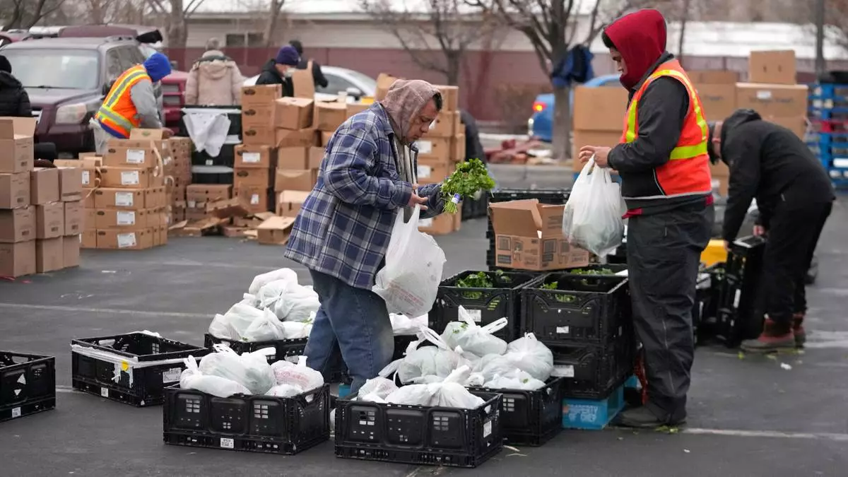 FILE - Utah Food Bank volunteers gather groceries for the needy at a mobile food pantry distribution site Dec. 21, 2022, in Salt Lake City. (AP Photo/Rick Bowmer, File)