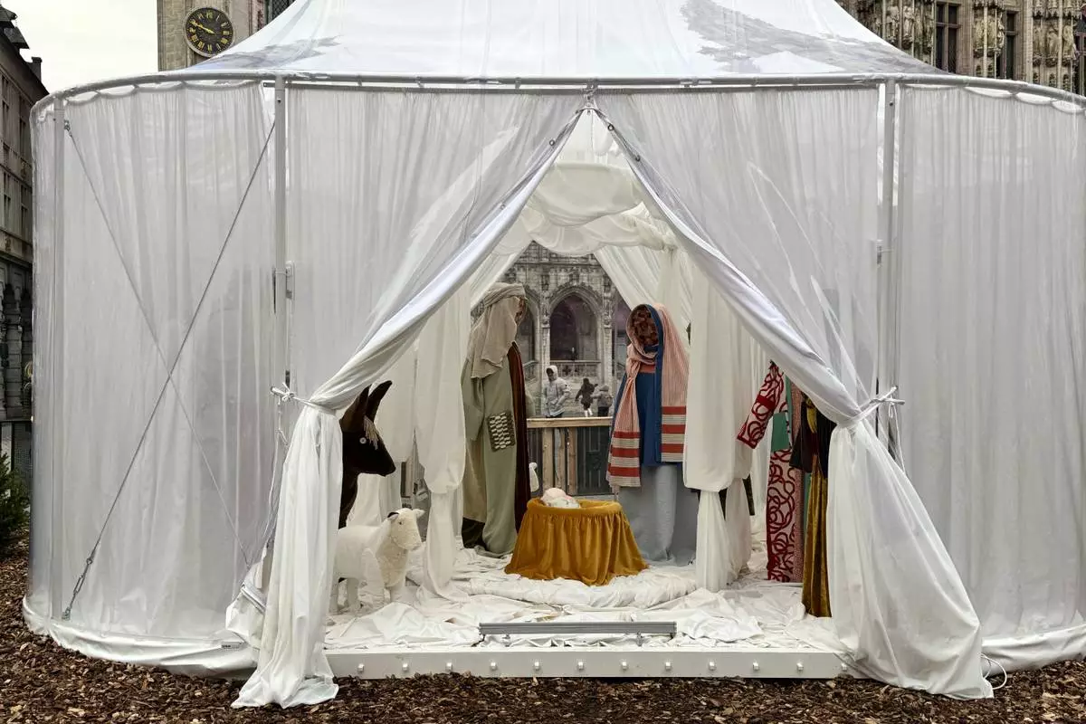 A Nativity scene containing characters with cloth faces, by Belgian artist Victoria-Maria Geyer, is displayed in a white tent in Brussels, Monday, Dec. 1, 2025. (AP Photo/Sylvain Plazy)