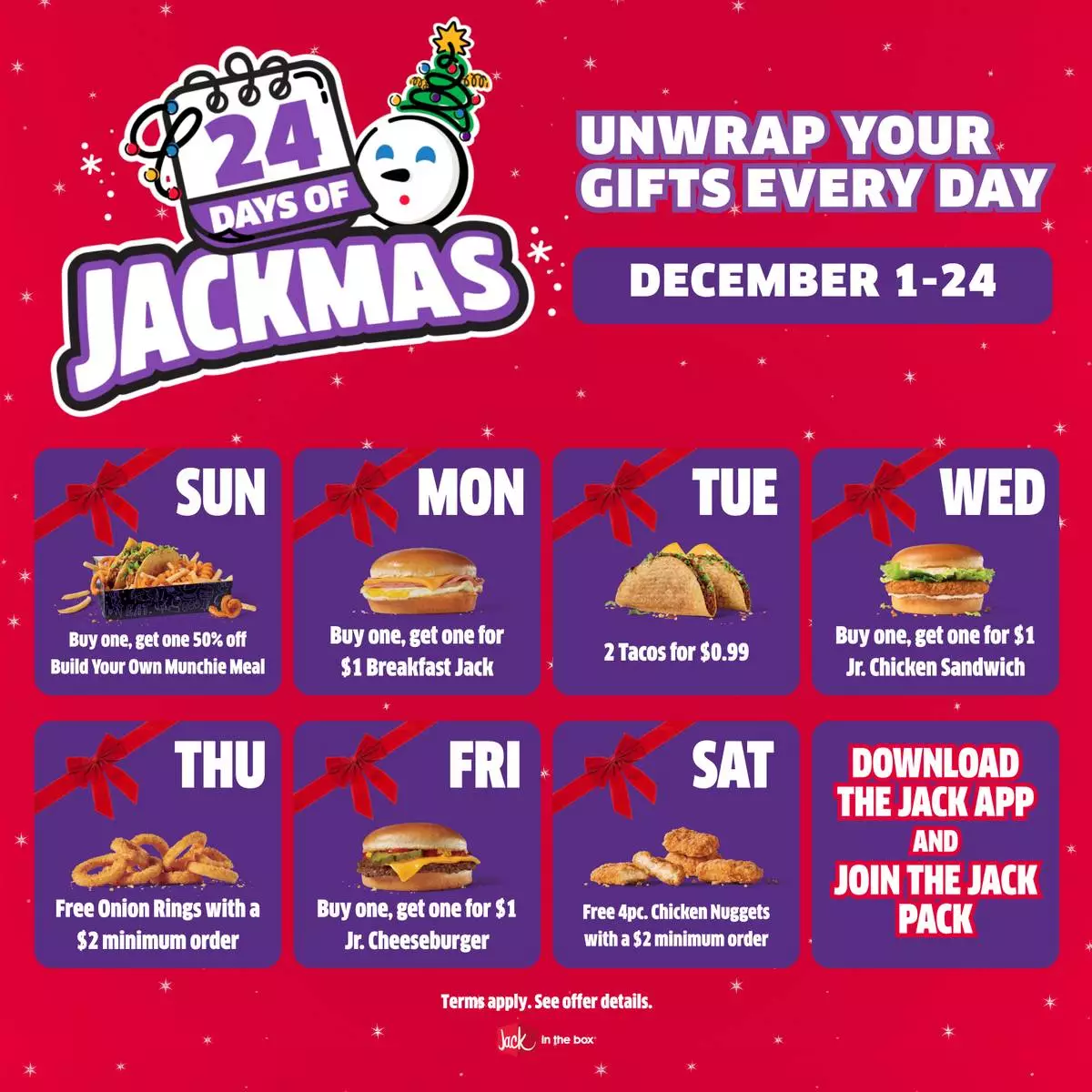 Download the Jack app and join the Jack Pack to unwrap these daily deals and enjoy exclusive year-round offers that keep the cravings coming. Make this Jackmas season the tastiest countdown to Christmas yet!