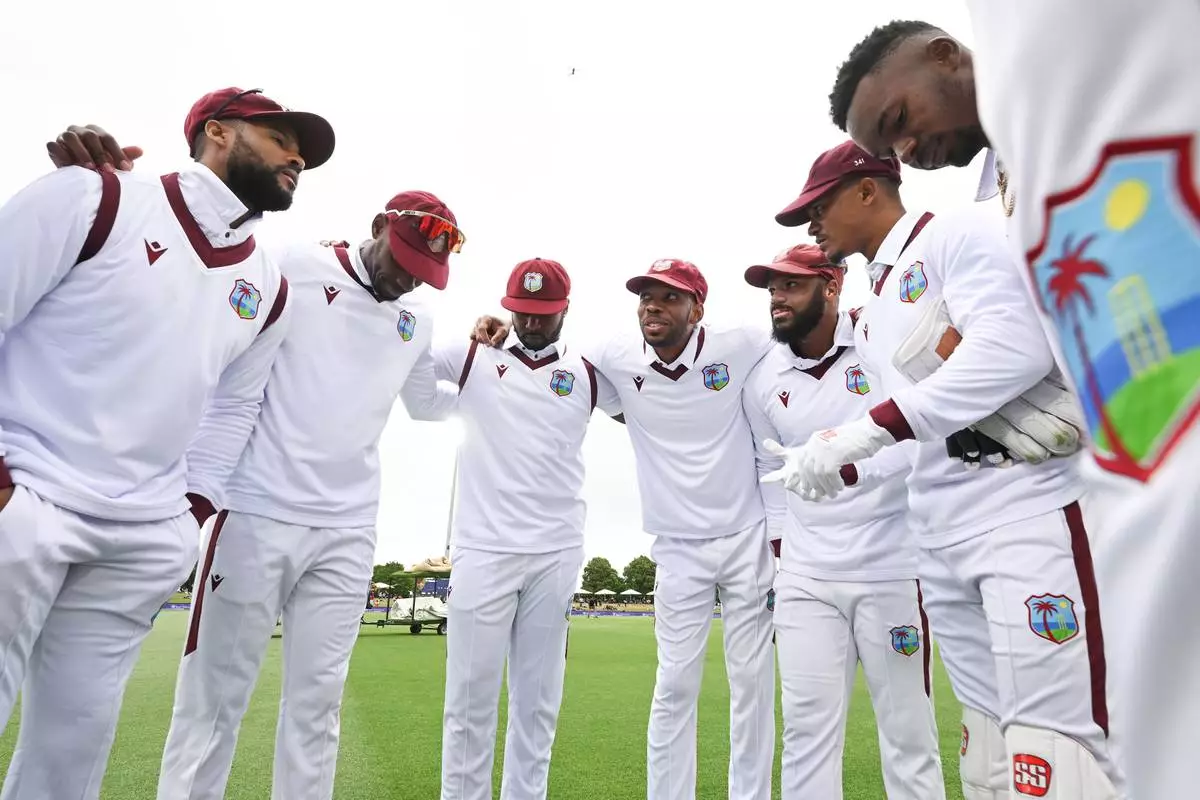 West Indies captain Roston Chase, center, talks to his players ahead of play against New Zealand during their cricket test match in Christchurch, New Zealand, Tuesday, Dec. 2, 2025. (Andrew Cornaga/Photosport via AP)