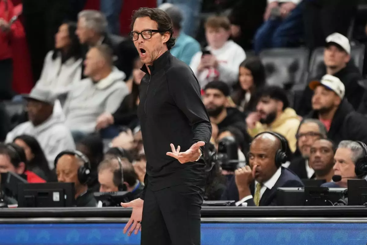 Atlanta Hawks head coach Quin Snyder reacts during the first half of an NBA basketball game against the Detroit Pistons, Monday, Dec. 1, 2025, in Detroit. (AP Photo/Ryan Sun)