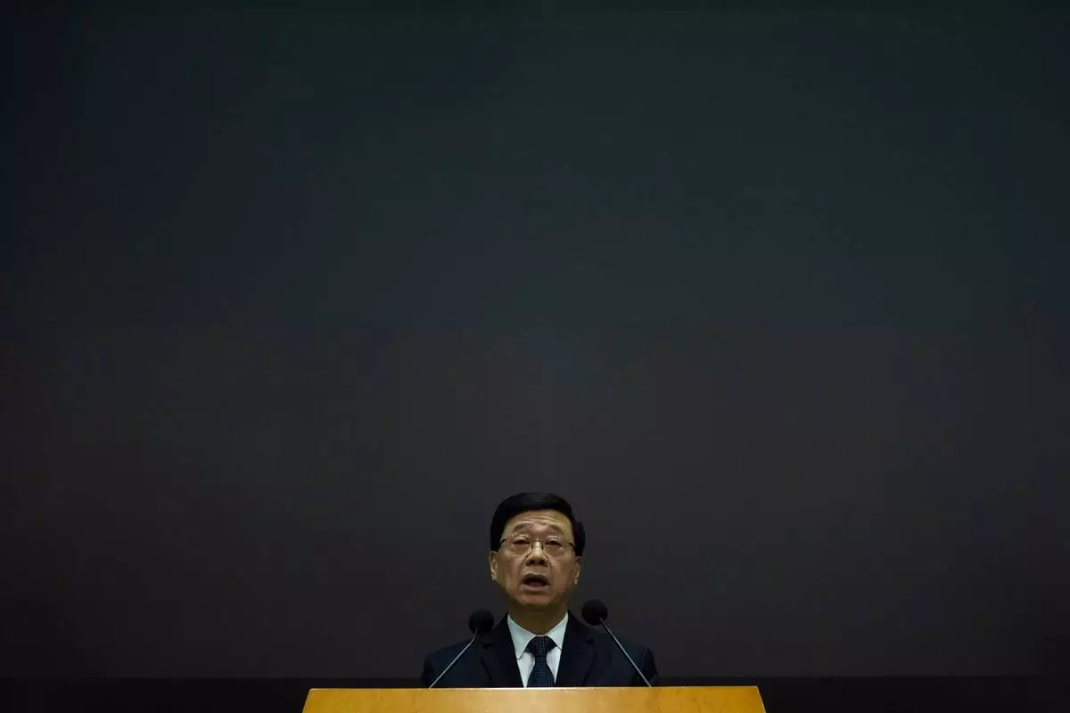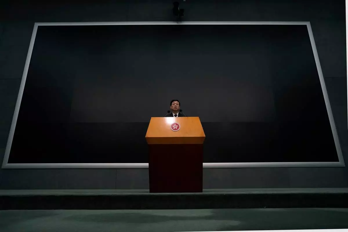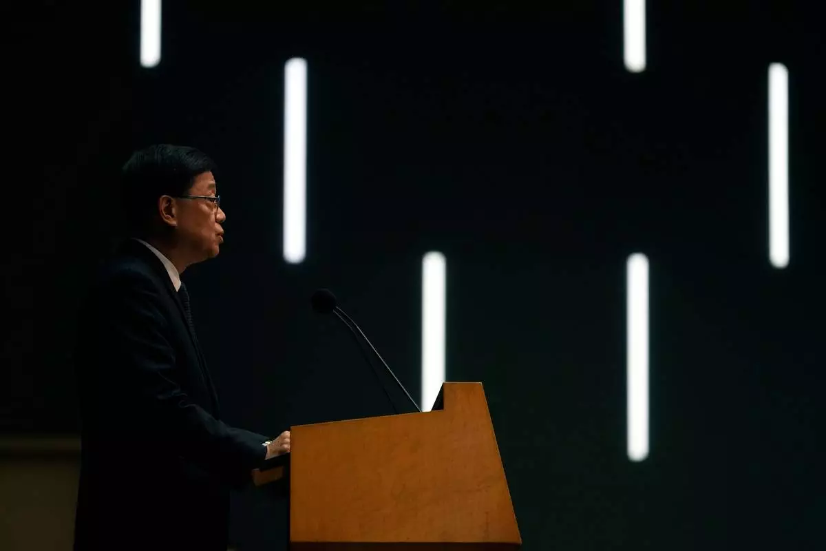 Hong Kong Chief Executive John Lee speaks during a press conference with a darken screen in the aftermath of a deadly fire in Hong Kong on Tuesday, Dec. 2, 2025. (AP Photo/Ng Han Guan)