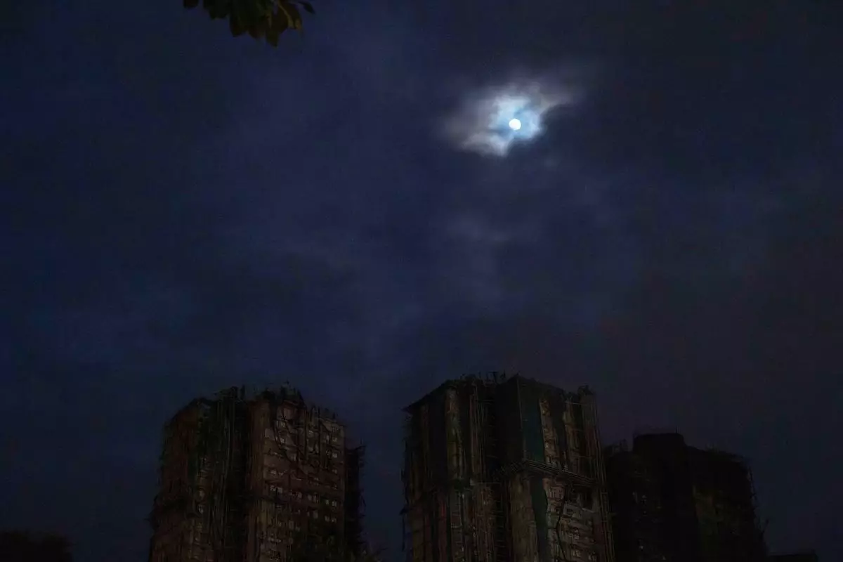 The moon rises over the site of a deadly fire at Wang Fuk Court, a residential estate in the Tai Po district of Hong Kong's New Territories, on Tuesday, Dec. 2, 2025. (AP Photo/Ng Han Guan)