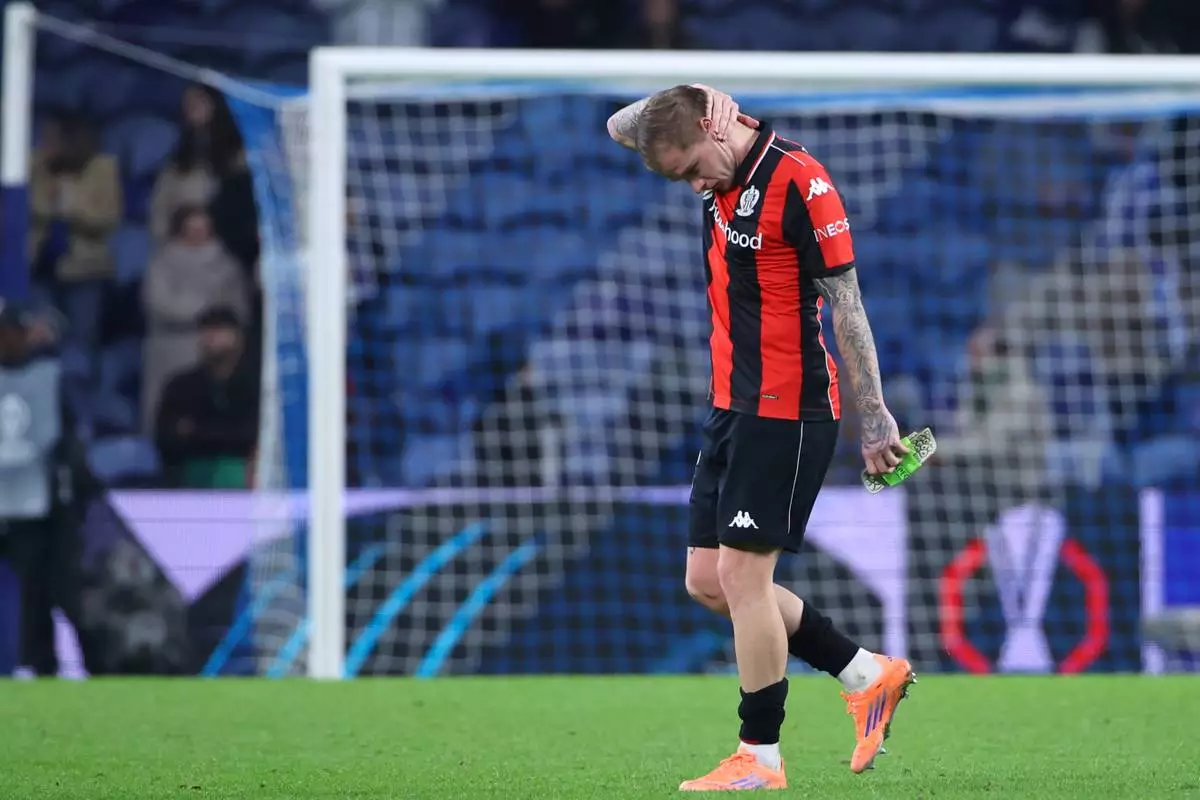 Nice's Melvin Bard reacts at the the end of the Europa League opening phase soccer match between FC Porto and Nice in Porto, Portugal, Thursday, Nov. 27, 2025. (AP Photo/Luis Vieira)