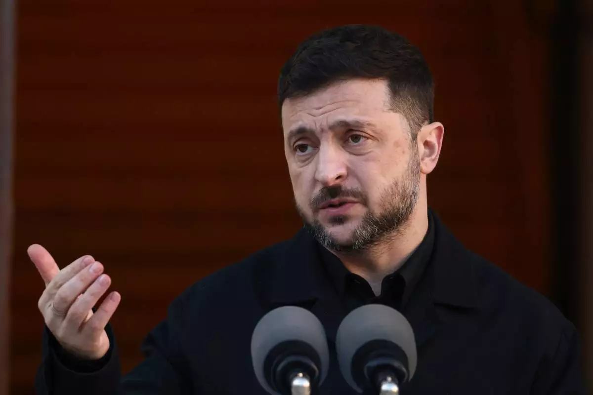 Ukraine President Volodymyr Zelenskyy, gestures while speaking as he takes part in a joint press conference with the Irish Prime Minister Micheal Martin in Dublin, Ireland, Tuesday, Dec. 2, 2025. (AP Photo/Peter Morrison)