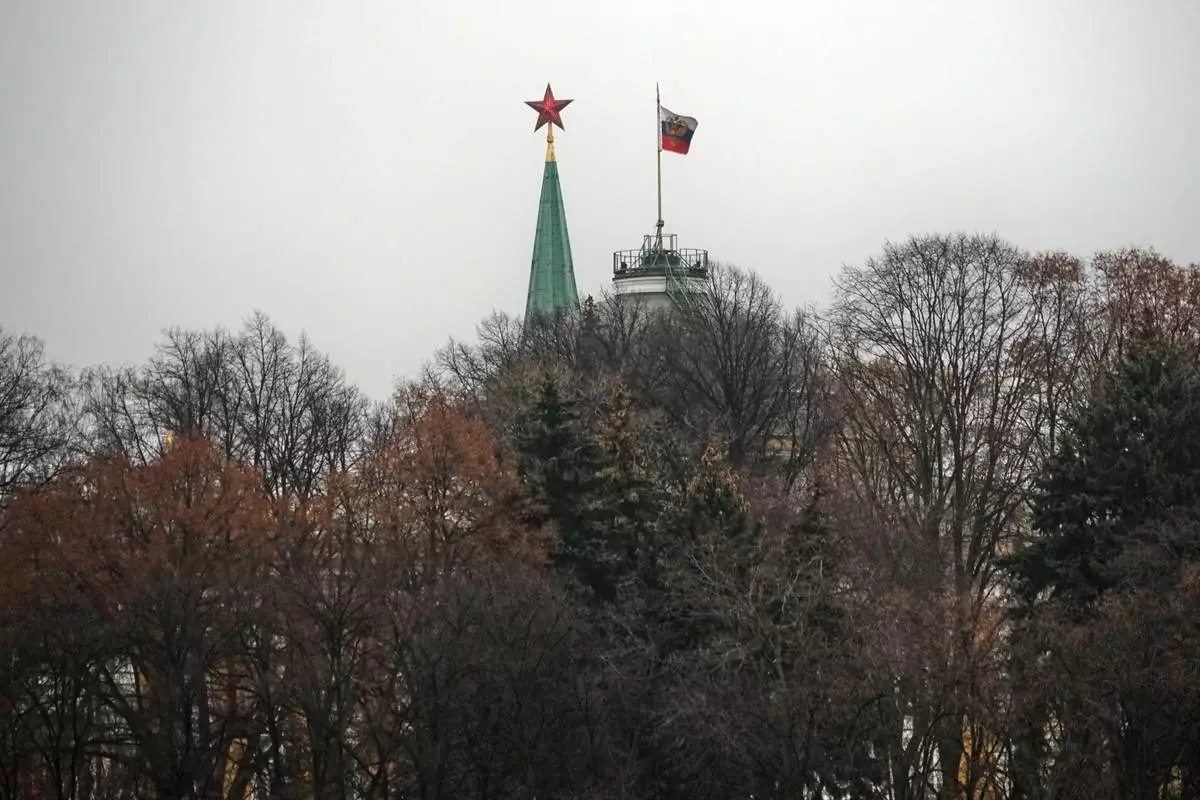 A red star atop of the Spasskaya Tower, left, and a Presidential Standard atop of the Senate Palace in the Moscow Kremlin, in Moscow, Tuesday, Dec. 2, 2025. (AP Photo/Alexander Zemlianichenko)