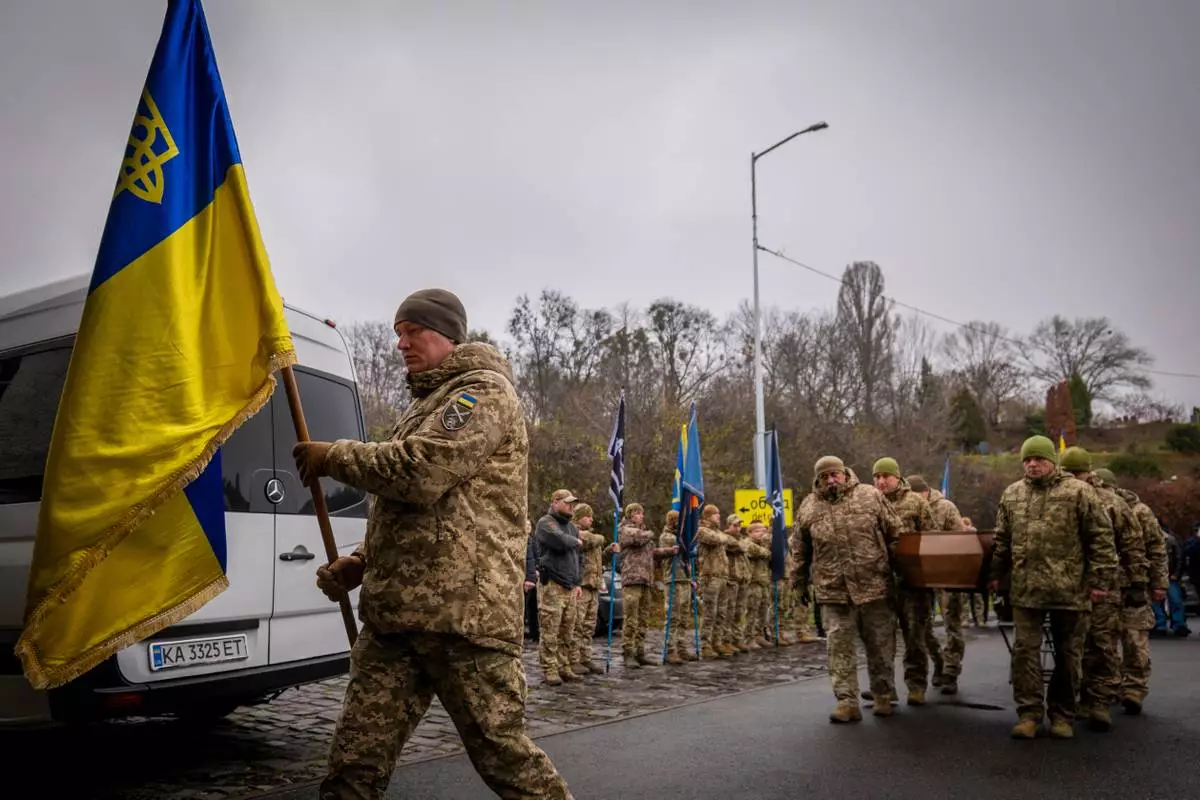 Servicemen carry the coffin of volunteer soldier Yukhym Agafontsev, 22, killed in a battle with the Russian troops, during a farewell ceremony in Kyiv, Ukraine, Tuesday, Dec. 2, 2025. (AP Photo/Dan Bashakov)