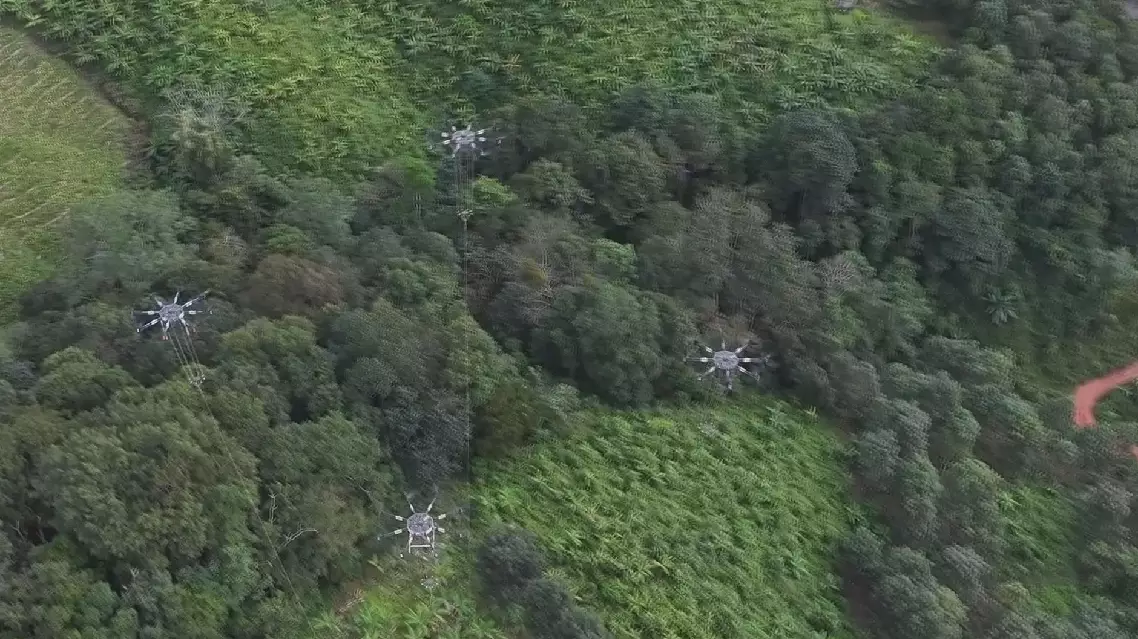 Heavy-lift drones have been used to transport power transmission tower parts to designated positions across a rainforest in southwest China's Yunnan Province, in a bid to reduce damage to the environment.