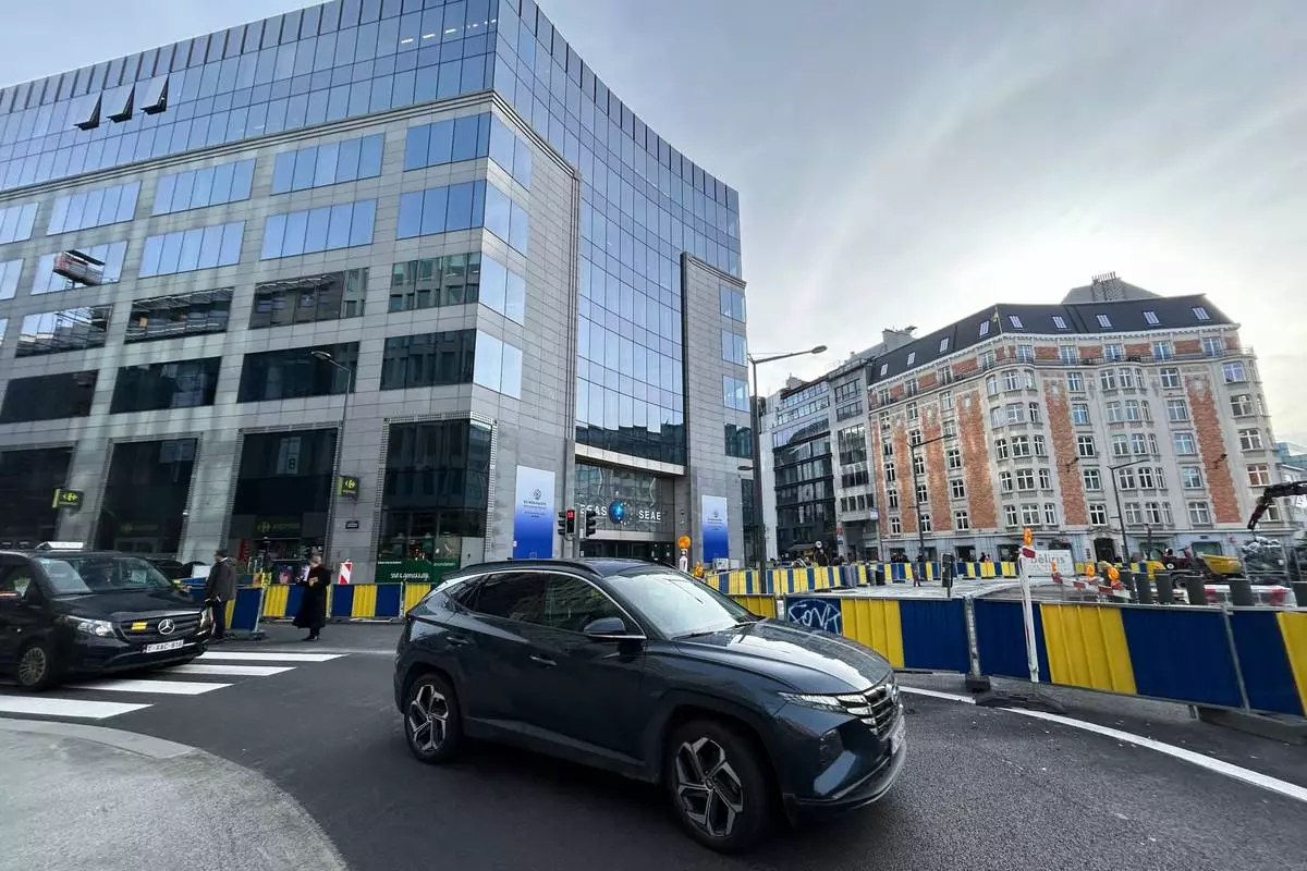 A car drives around a rotary near the entrance of the European External Action Service in the European Quarter of Brussels, Tuesday, Dec. 2, 2025. (AP Photo/Mark Carlson)