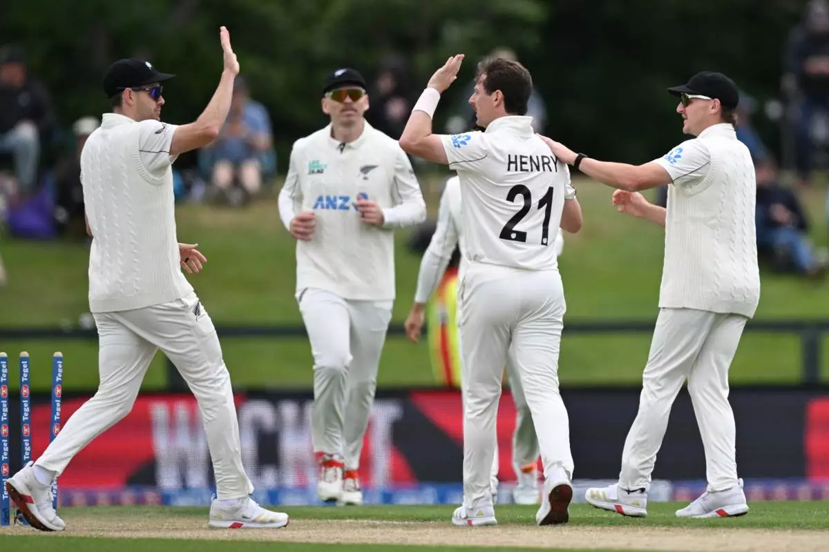 New Zealand bowler Matt Henry, second right, celebrates with teammates after taking the wicket of the West Indies' Alick Athanaze during their cricket test match in Christchurch, New Zealand, Wednesday, Dec. 3, 2025. (Andrew Cornaga/Photosport via AP)