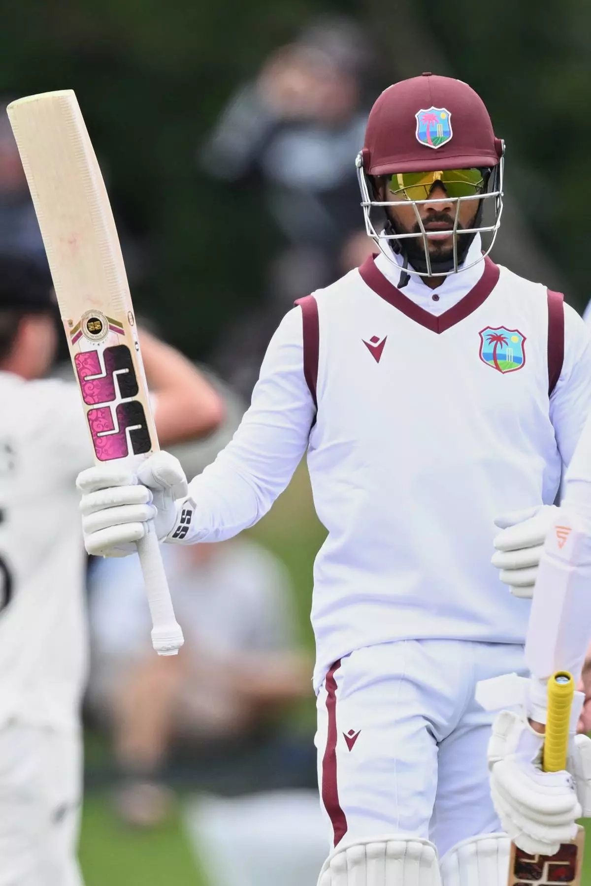 West Indies' batsman Shai Hope raises his bat after making 50 runs against New Zealand during the second day of their cricket test match in Christchurch, New Zealand, Wednesday, Dec. 3, 2025. (Andrew Cornaga/Photosport via AP)