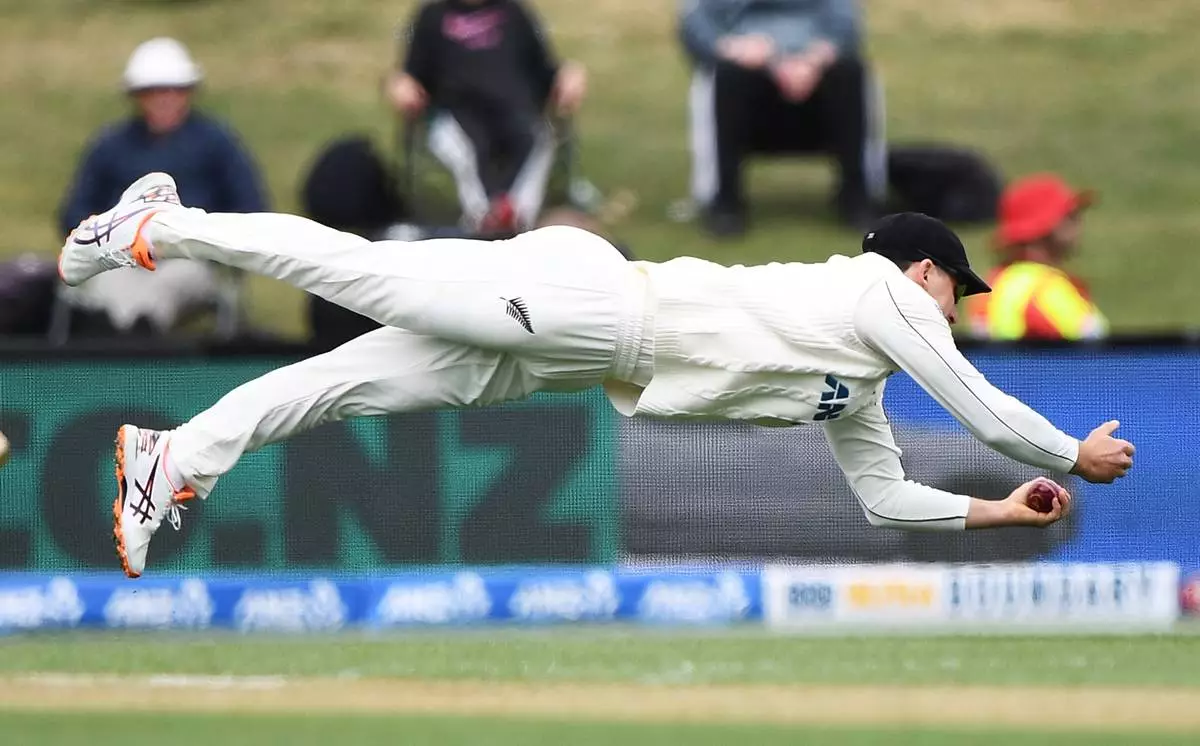 New Zealand's Will Young takes a catch to dismiss West Indies'John Campbell during their cricket test match in Christchurch, New Zealand, Wednesday, Dec. 3, 2025. (Chris Symes/Photosport via AP)