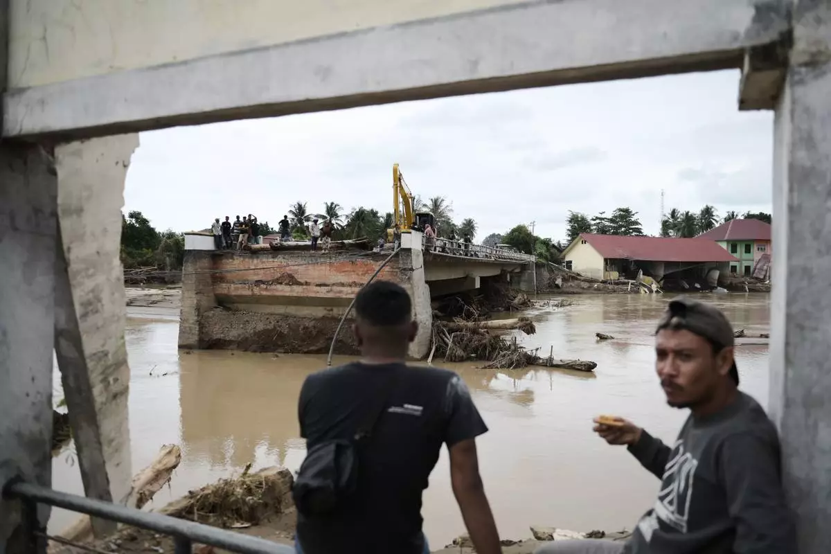Men sit near a bridge collapsed during a flash flood in Pidie Jaya, Aceh province, Indonesia, Tuesday, Dec. 2, 2025. (AP Photo/Reza Saifullah)