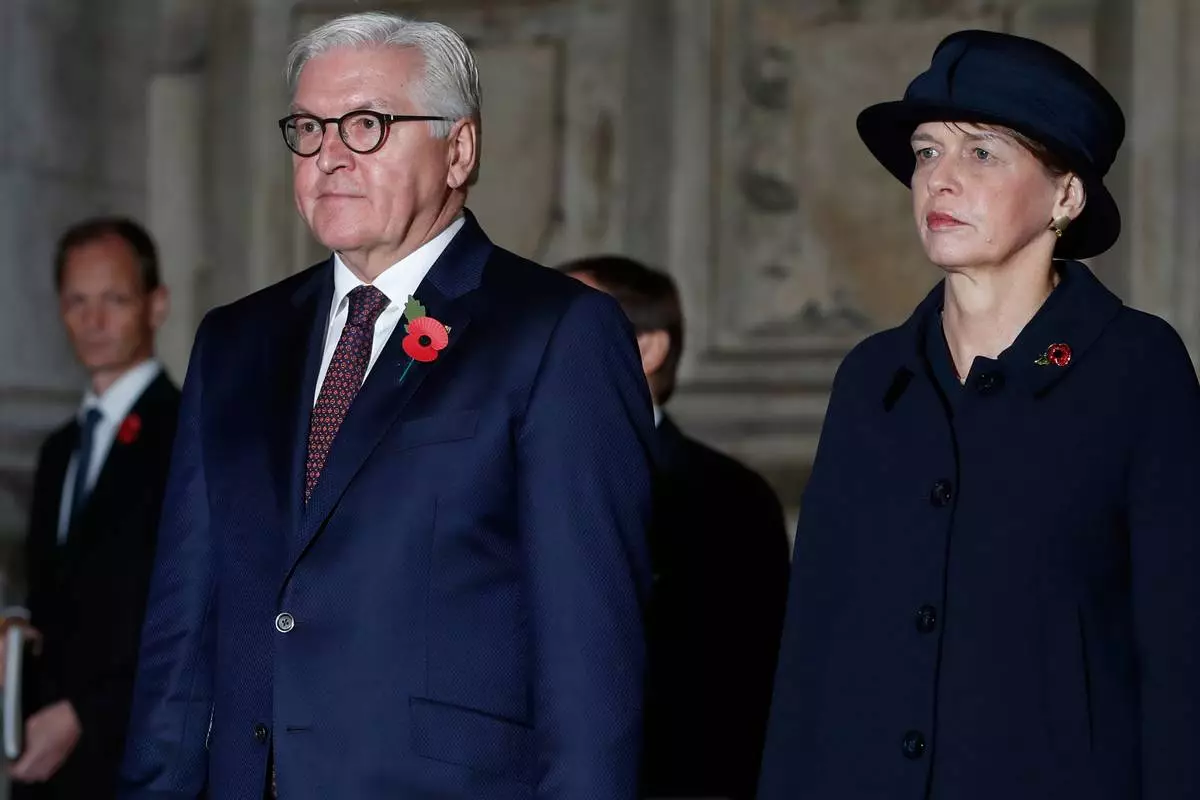 FILE - German President Frank-Walter Steinmeier, front left, and his wife, Elke Budenbender, right, leave Westminster Abbey in London, England, Nov. 11, 2018. (AP Photo/Alastair Grant, File)