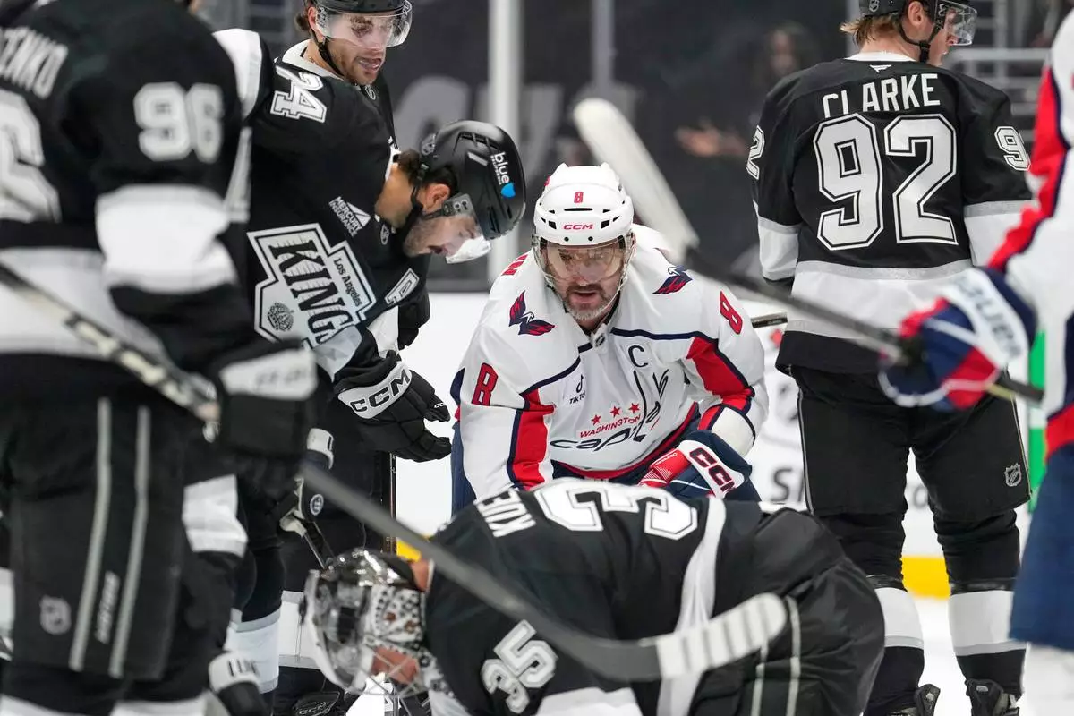 Washington Capitals left wing Alex Ovechkin, second from right, waits for the puck to come loose as Los Angeles Kings left wing Andrei Kuzmenko, left, center Anze Kopitar, second from left, center Phillip Danault, third from left, goaltender Darcy Kuemper, below, and defenseman Brandt Clarke stand by during the first period of an NHL hockey game Tuesday, Dec. 2, 2025, in Los Angeles. (AP Photo/Mark J. Terrill)