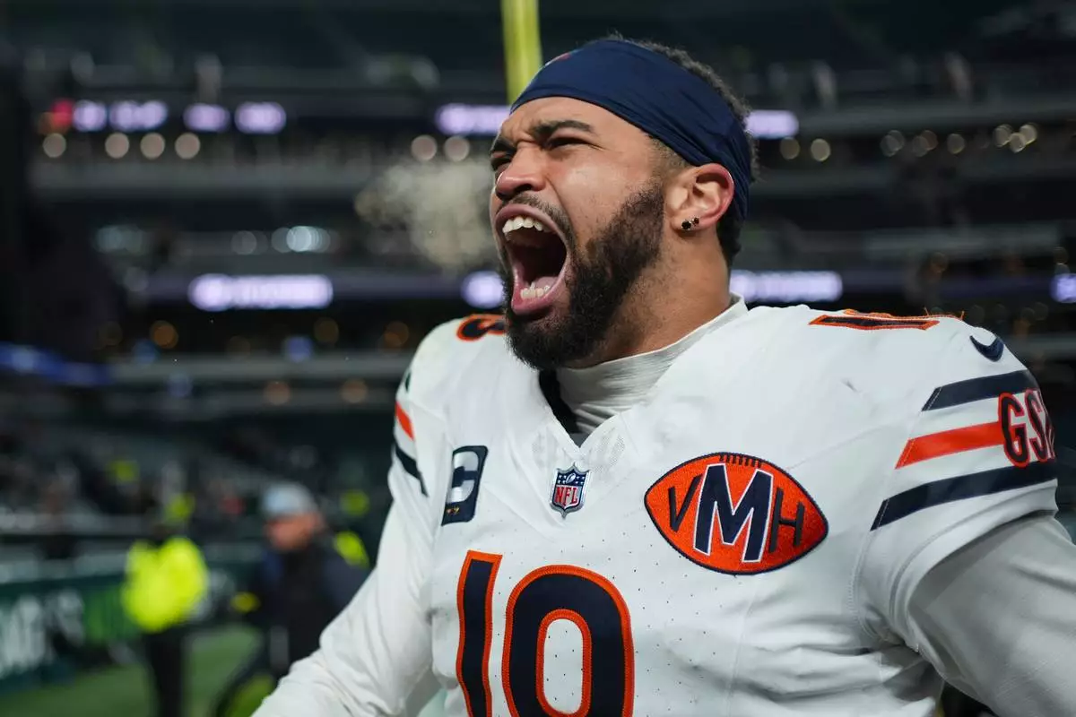Chicago Bears quarterback Caleb Williams (18) celebrates his team's win over the Philadelphia Eagles in an NFL football game, Friday, Nov. 28, 2025, in Philadelphia. (AP Photo/Matt Slocum)