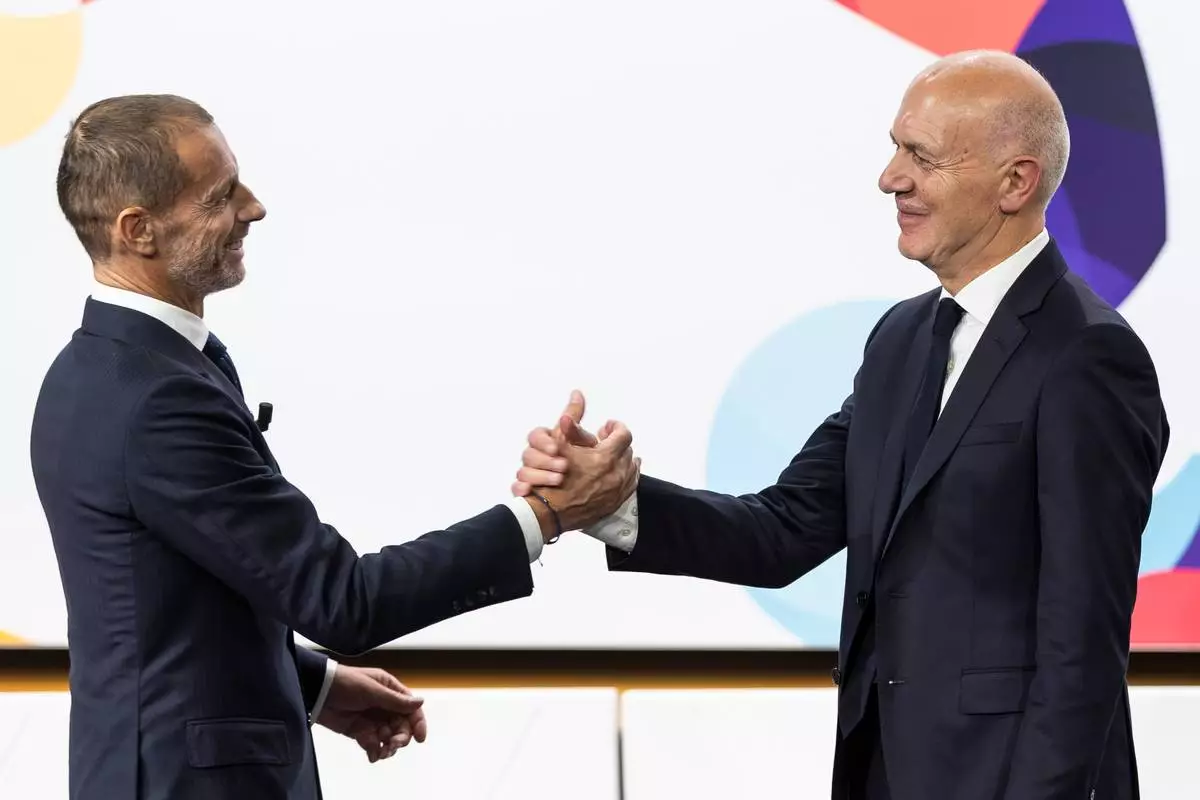 UEFA President Aleksander Ceferin, left, and German Football Association (DFB) president Bernd Neuendorf, right, shake hands during the the announcement ceremony for the host country of the UEFA Women's EURO 2029, in Nyon, Switzerland, Wednesday, Dec. 3, 2025. (Cyril Zingaro/Keystone via AP)