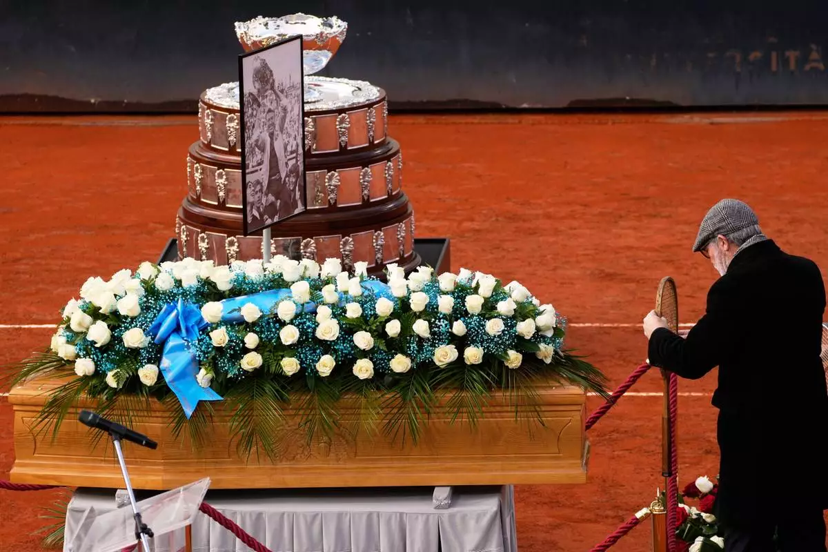 Two tennis rackets and the Davis Cup won by Italy in 1976 under Pietrangeli’s captaincy were placed next to the coffin, which was decorated in blue and white flowers.