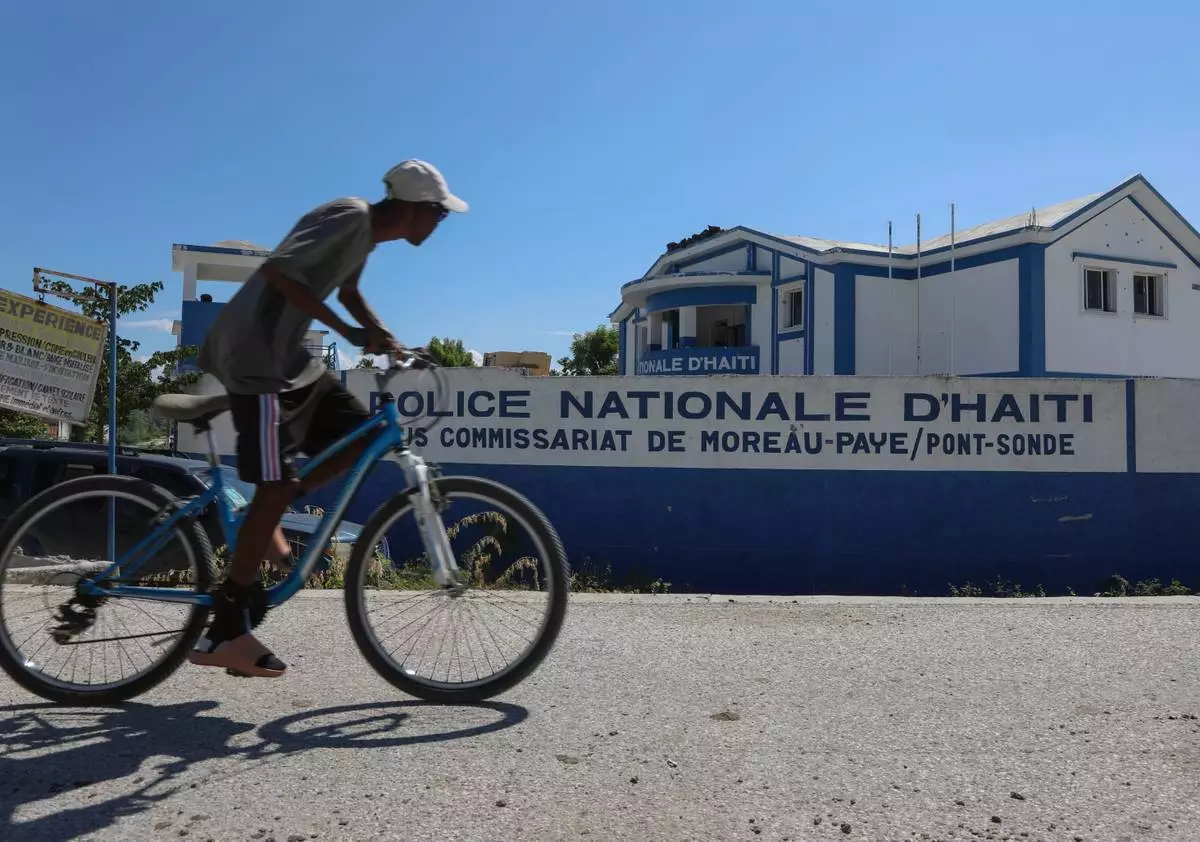 FILE - A man rides his bicycle past police station in Pont-Sonde, Haiti, Oct. 7, 2024. (AP Photo/Odelyn Joseph, File)