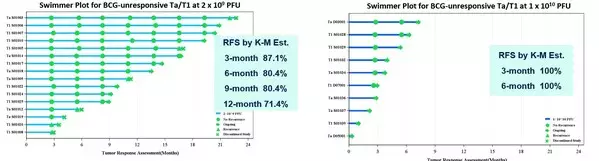 - Among 16 evaluable patients with BCG-unresponsive papillary who received MVR-T3011 at a dose of 2x109 PFU, the 3-month, 6-month, 9-month and 12-month recurrence-free survival (RFS) rates were 87.1%, 80.4%, 80.4% and 71.4%, respectively. Among 6 evaluable patients who received MVR-T3011 at a dose of 1x1010 PFU, 100% of patients remained recurrence free at Month 3 and Month 6.