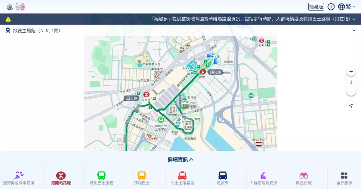 The TD has co-ordinated with local and cross-boundary public transport operators to strengthen their services during dispersal. The MTR will enhance the interval between trains of the Tuen Ma Line. The last MTR train to Lo Wu Station via interchanging at Tai Wai Station on the East Rail Line will depart from Sung Wong Toi Station at 10.59pm and Kai Tak Station at 11.01pm. Franchised bus companies will provide 11 special bus routes at the Sung Wong Toi Road Pick-up/Drop-off Area (PUDOA) to Lok Ma Chau (San Tin) Public Transport Interchange (route No. SP12), the Hong Kong-Zhuhai-Macao Bridge Hong Kong Port and Airport (route No. A25S), and major districts across the territory.
