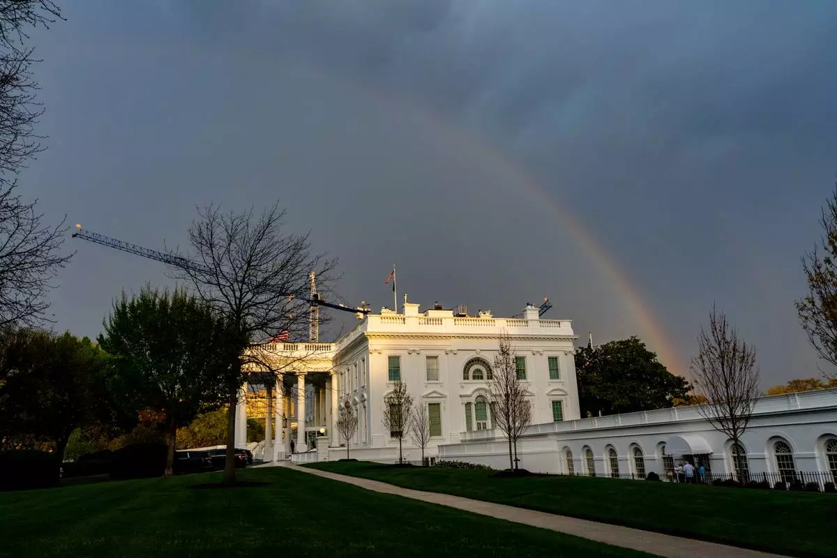 A rainbow forms over the White House on Wednesday, April 1, 2026, in Washington. (AP Photo/Alex Brandon)