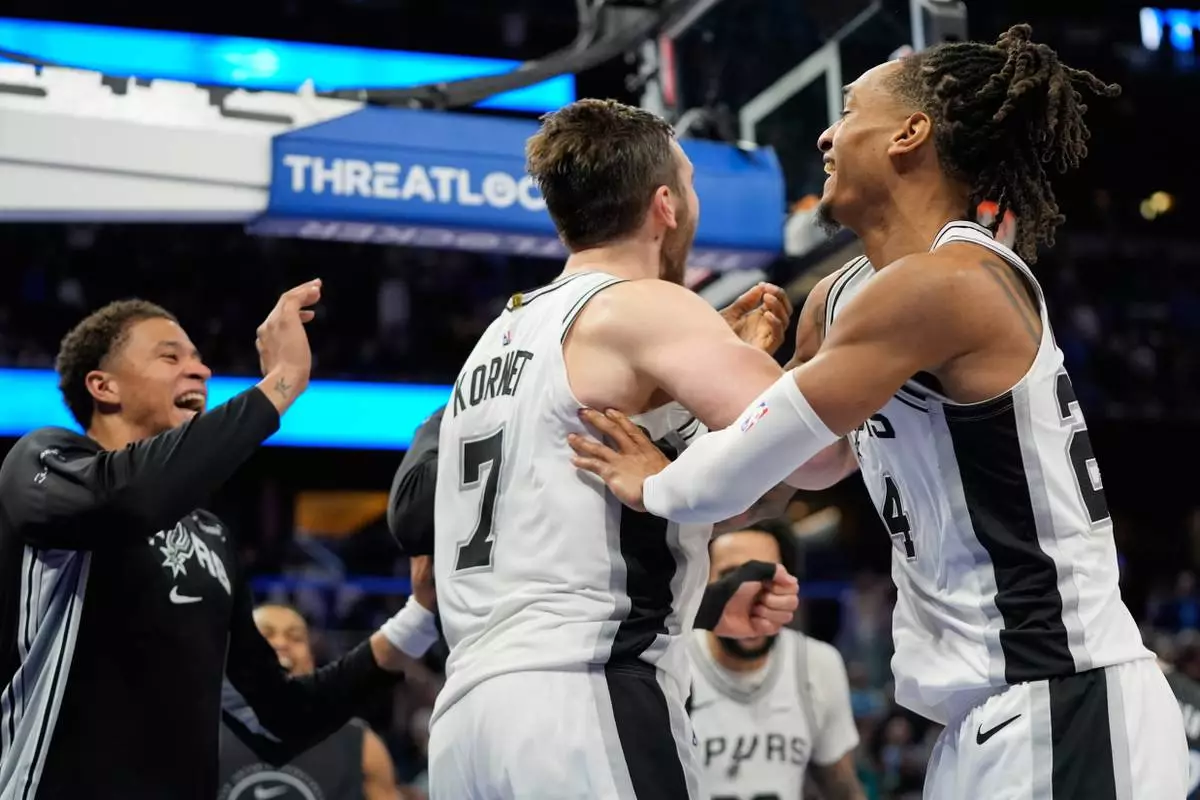 San Antonio Spurs center Luke Kornet (7) celebrates with teammates after blocking a shot by Orlando Magic forward Franz Wagner to win an NBA basketball game, Wednesday, Dec. 3, 2025, in Orlando, Fla. (AP Photo/John Raoux)